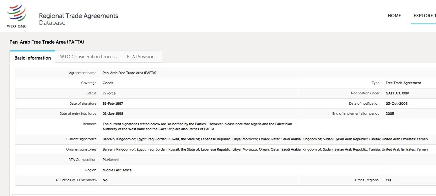 PAFTA Agreement https://rtais.wto.org/rtadocs/16/TOA/English/Pan-Arab%20Free%20Trade%20Area%20Agreement%20(1997).pdf