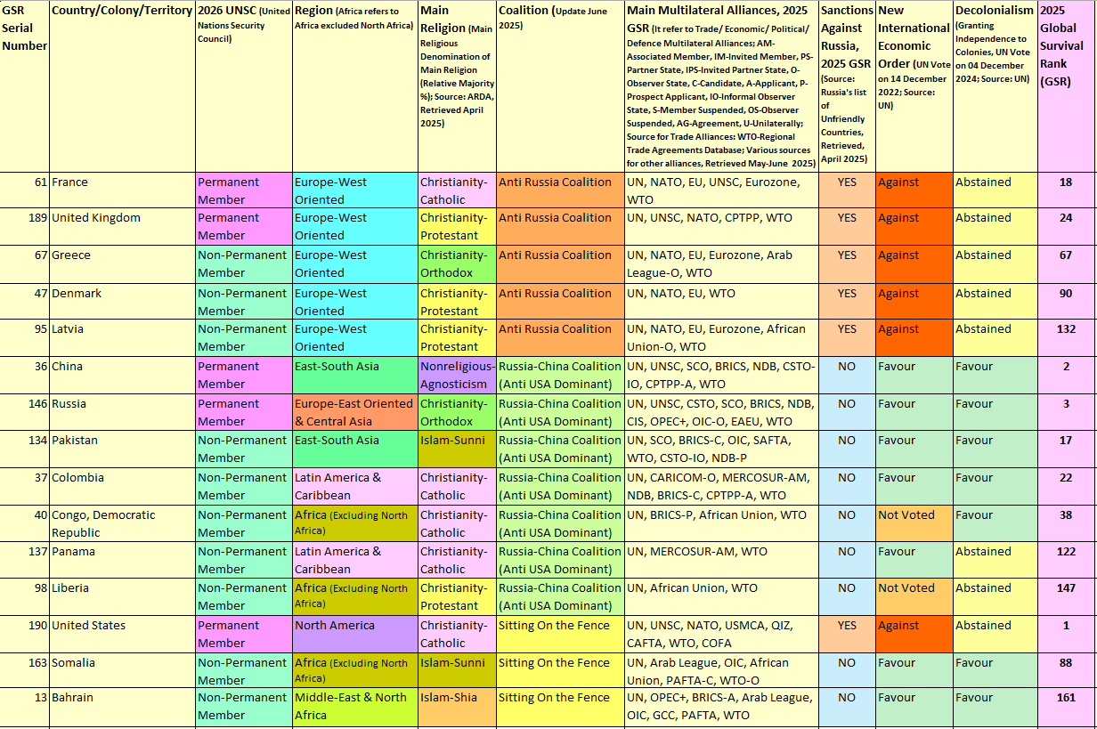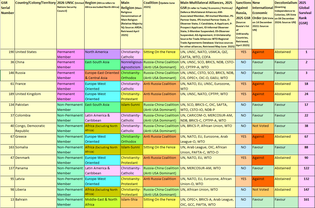 List of Members of 2026 UNSC, sorted by Coalitions based on 2025 Global Survival Rank (GSR) by Dr. Ziva Rozen-Bakher