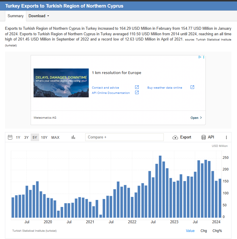 Turkey Exports to Turkish Region of Northern Cyprus: https://tradingeconomics.com/turkey/exports-to-turkish-region-of-northern-cyprus