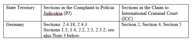 The complaint to the police in Germany is based on the Claim that was given to the International Criminal Court (ICC) on 29 January 2020, as well as on the Complaint that was given to Polícia Judiciária (PJ) (Portuguese Police) on 9 January 2020 in relation to the crimes that are committed against Dr Ziva Rozen-Bakher and her son Daniel Bakher in Europe by the International Conspiracy Group, namely the ‘Israeli Cover-up Group and its European Conspirators’ in order to cover-up attempts of murders and other serious crimes, as described in Table I below that presents the crimes that are committed at each state territory as part of the single set of cover-up crimes that are committed by the ‘Israeli Cover-up Group and its European Conspirators’ in Europe in order to obstruct the justice and prevent from high-rank figures getting punishment for their crimes.