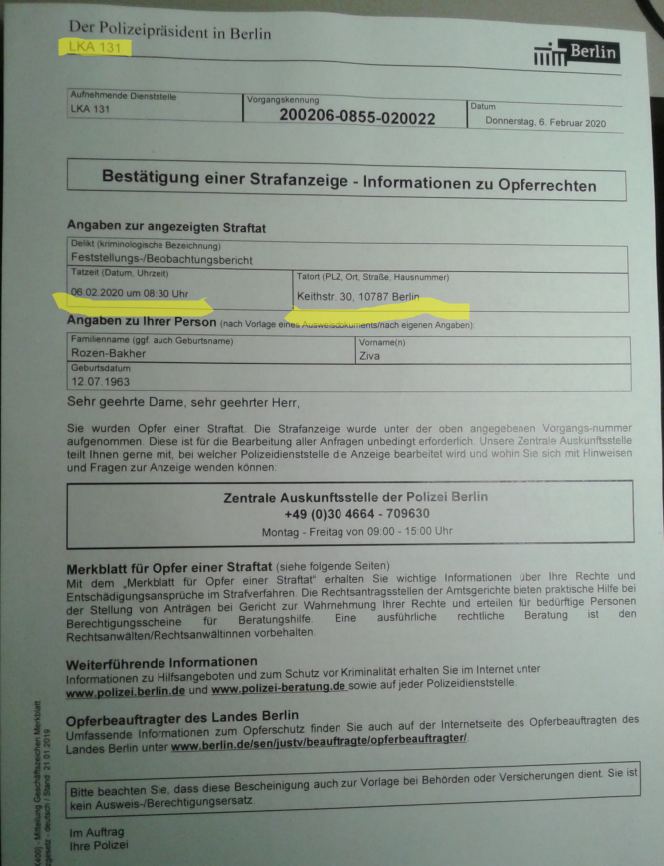 CM059, Complaint to Berlin Police, Germany, 6 February 2020