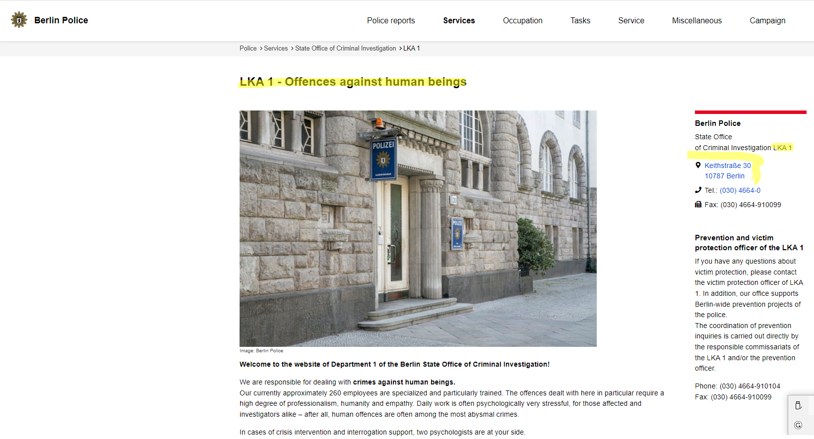 The Full Complaint in hard-copy was given in-person to Landeskriminalamt (LKA) State Criminal Police Office, Germany, LKA 1, Keithstraße 30 10787 Berlin, Germany (Vorgangskennung: 200206-0855-020022)