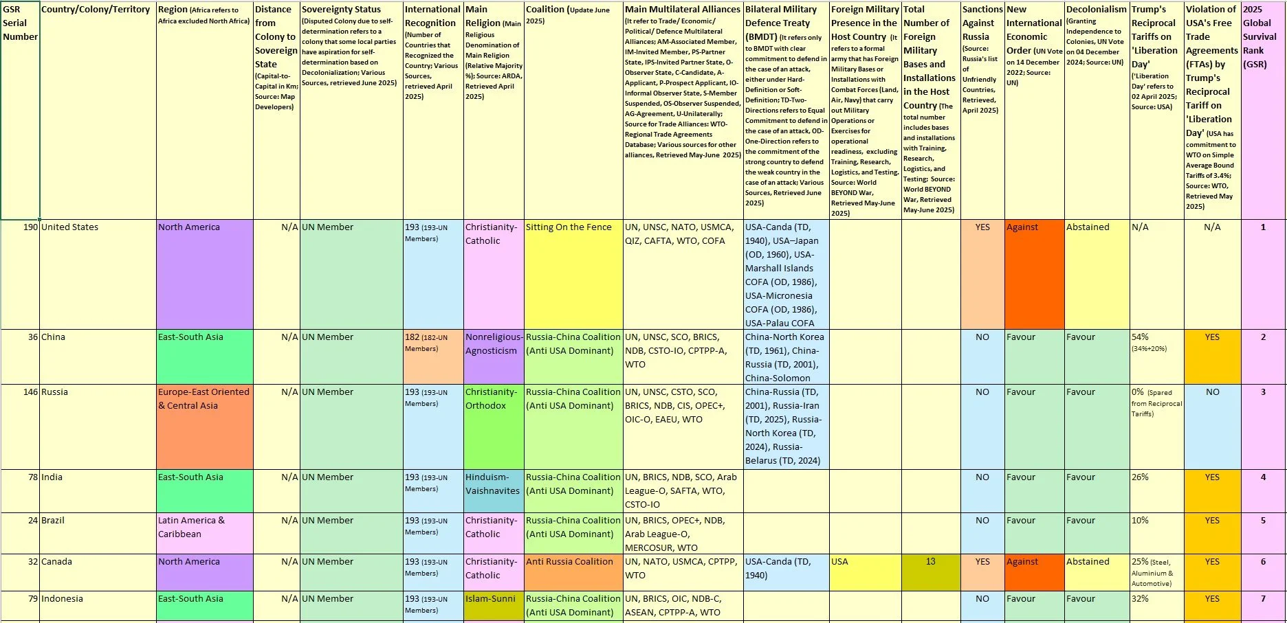 Section E3. Determination of Geopolitical Position: Sanctions, Economic Order, Decolonialism, and Trade-war, 2025 Global Survival Rank (GSR) by Dr. Ziva Rozen-Bakher https://www.rozen-bakher.com/gsr/2025/e/determination-geopolitical-position