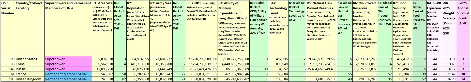 Table 6. Comparison of Superpowers and Permanent Members of UNSC: Global Survival Rank Indicators (R1-R7), sorted by 2025 Global Survival Rank (GSR)