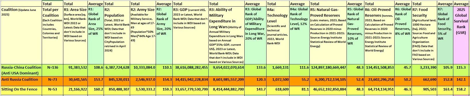 Table 4. Comparison of Coalitions: Indicators (R1-R7) of 2025 Global Survival Rank (GSR) per Each Coalition, Total and Average