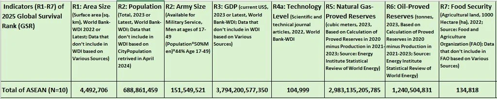 Table 73. ASEAN - Members: Global Survival Rank Indicators (R1-R7), sorted by 2025 Global Survival Rank (GSR)