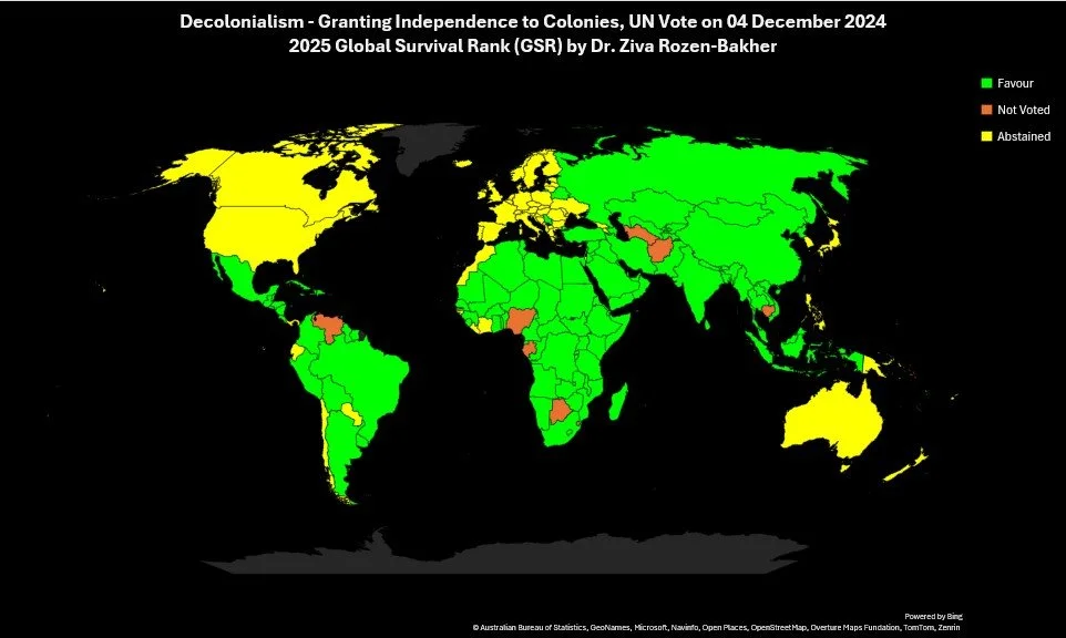 Section E3.3.1 Results of UN Vote on Decolonialism by UN Members, sorted by 2025 Global Survival Rank (GSR)