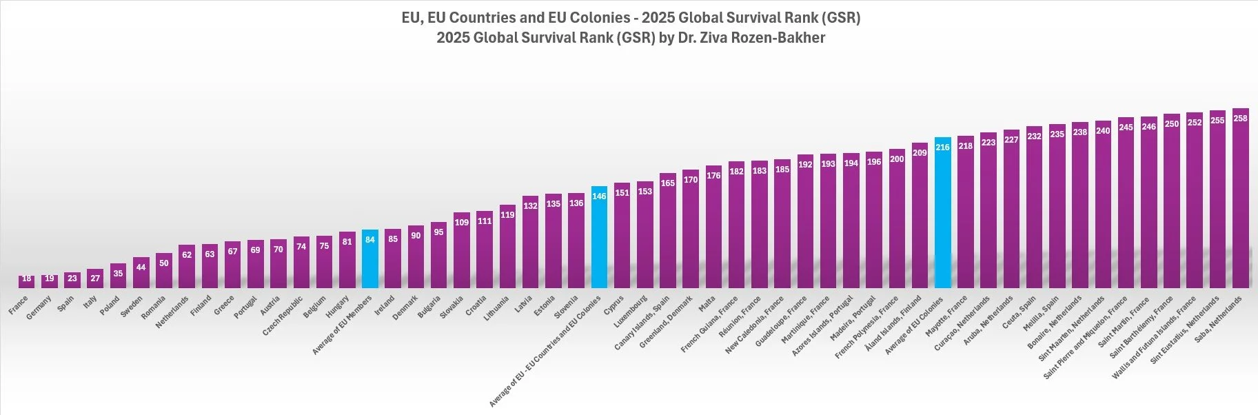 Chart 76. Each EU Member and Each EU Colony by 2025 Global Survival Rank (GSR)