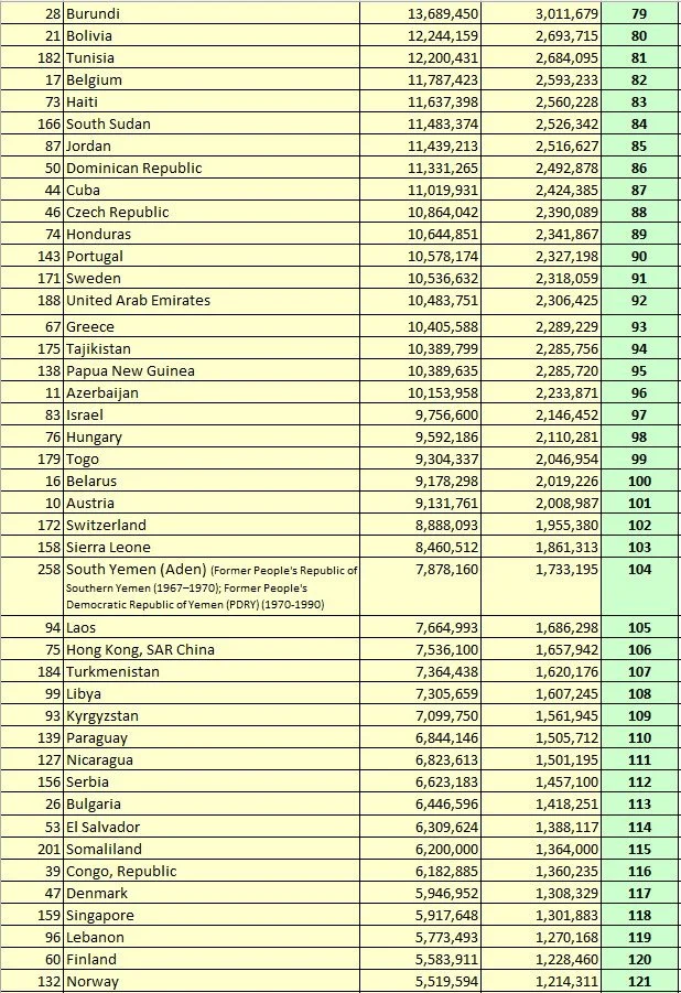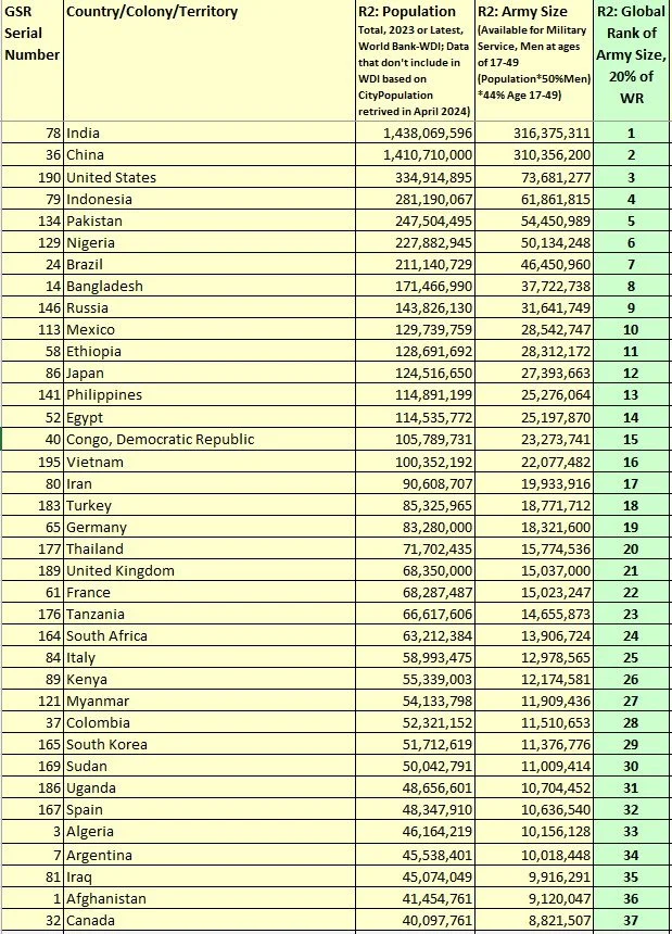 Section E4.3.2 Population and Army Size Indicators (R2): All UN Members and Non-UN Members, sorted by the Rank of R2