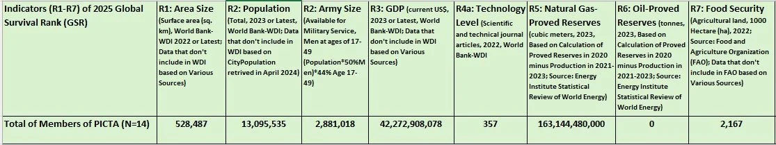 Table 132. PICTA - Members: Global Survival Rank Indicators (R1-R7), sorted by 2025 Global Survival Rank (GSR)