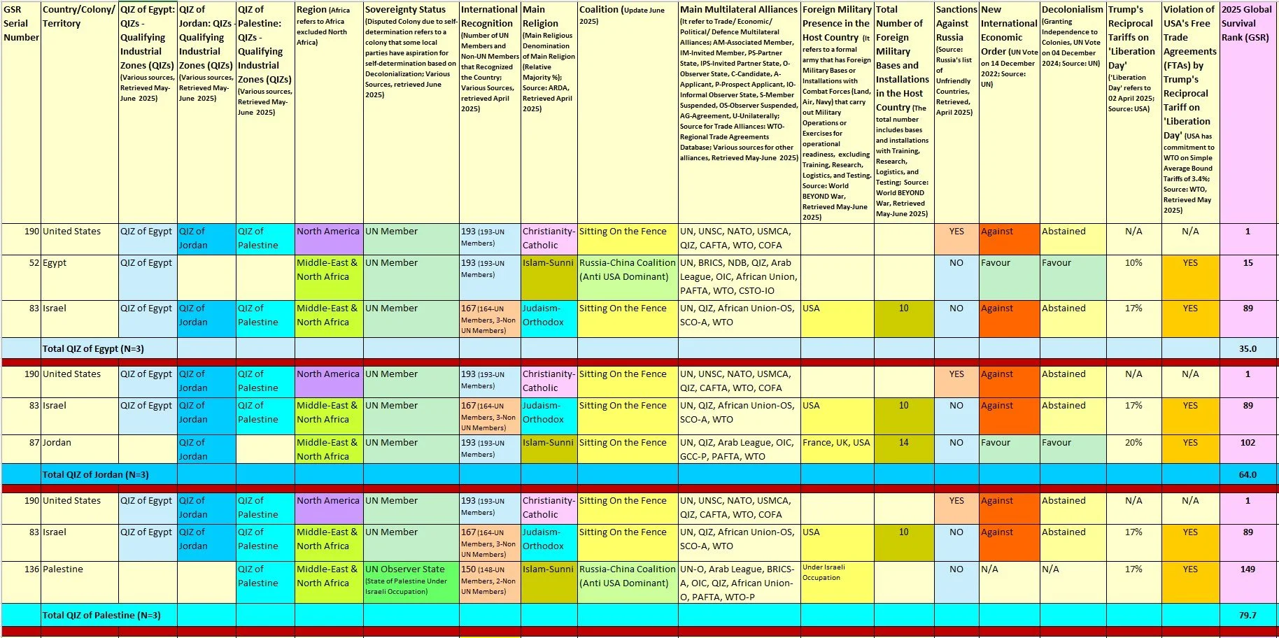 Table 133. QIZs - Membership Status: Geopolitical Position, sorted by 2025 Global Survival Rank (GSR)