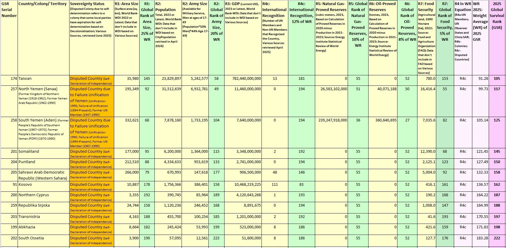 Table 43. Disputed Countries: Global Survival Rank Indicators (R1-R7), sorted by 2025 Global Survival Rank (GSR)