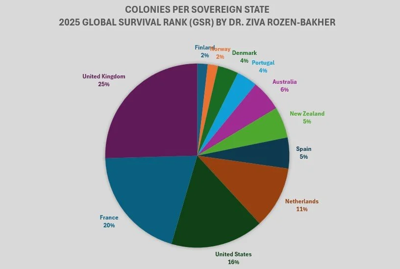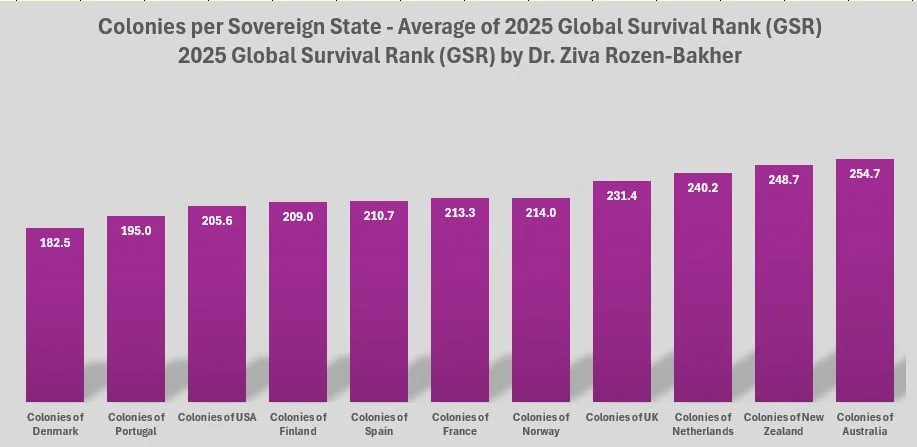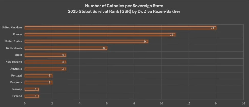 Chart 33. Colonies per Sovereign State, Average of 2025 Global Survival Rank (GSR)