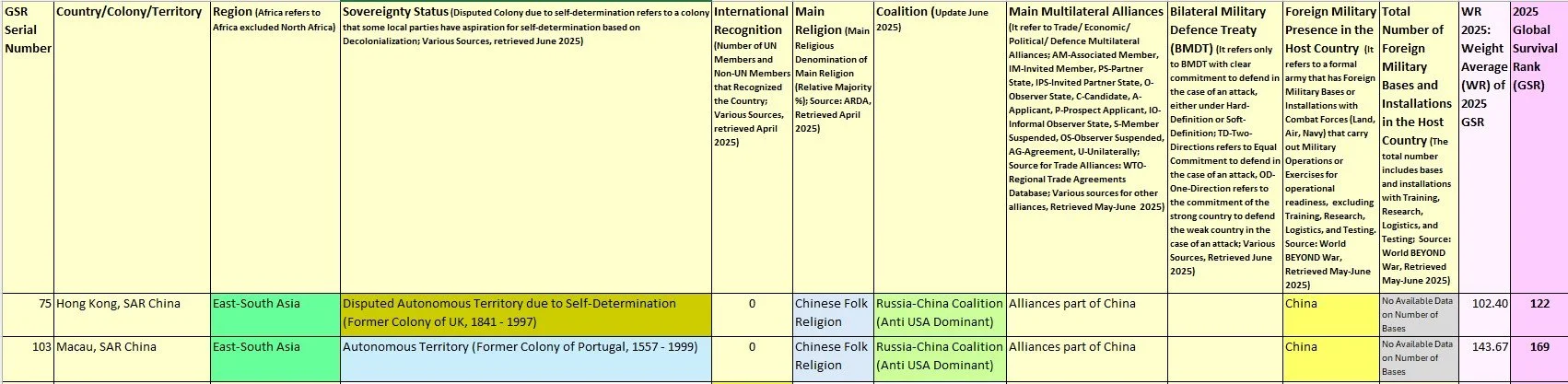 Section E6.4. Special Administrative Regions (SARs) of China, sorted by 2025 Global Survival Rank (GSR)