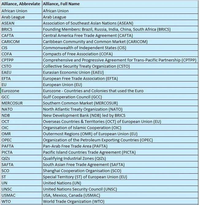 List of Alliances Included in 2025 GSR, Full Name and Abbreviation