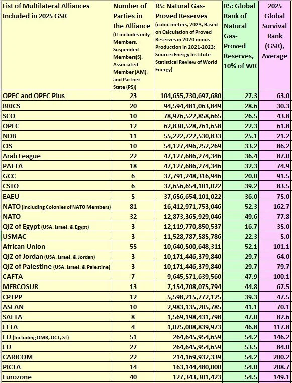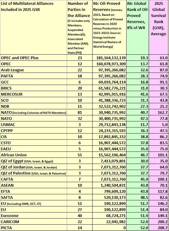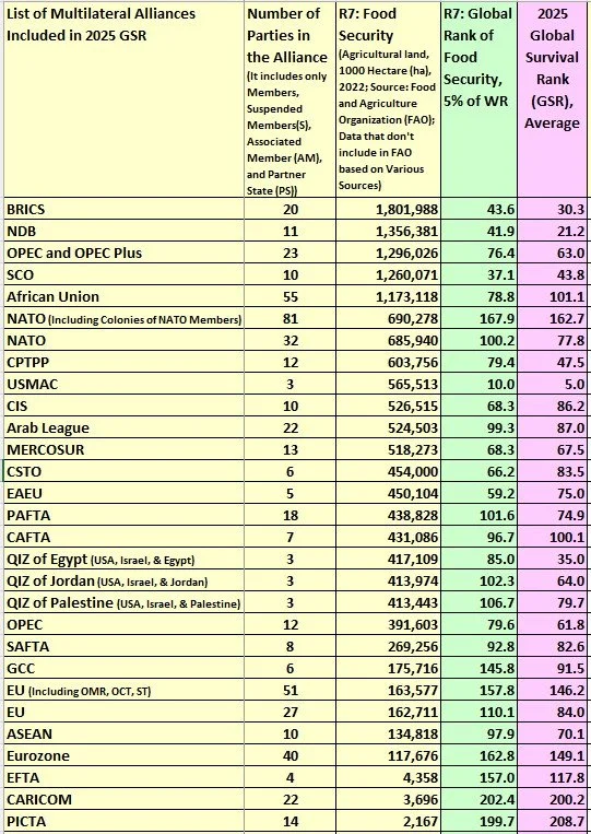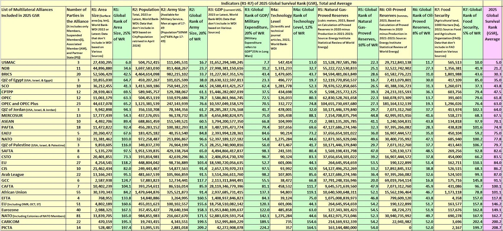Table 150. Comparison of Multilateral Alliances: Indicators R1-R7, sorted by 2025 Global Survival Rank (GSR)