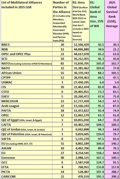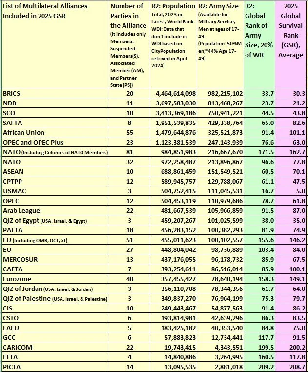 Section F1.2 Comparison of Multilateral Alliances, sorted by 2025 Global Survival Rank (GSR)