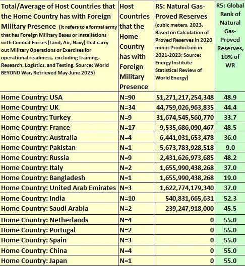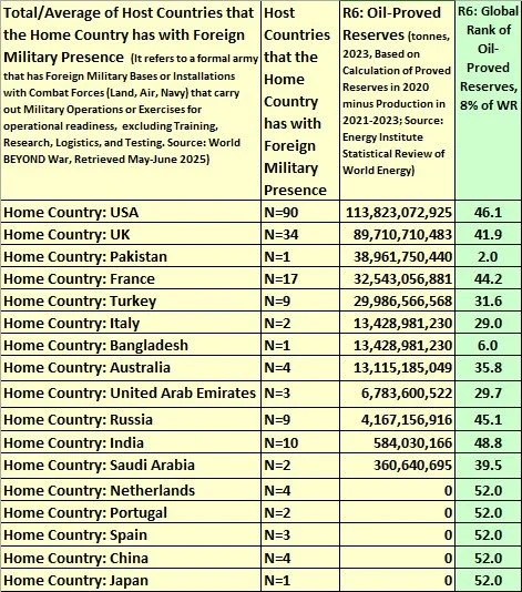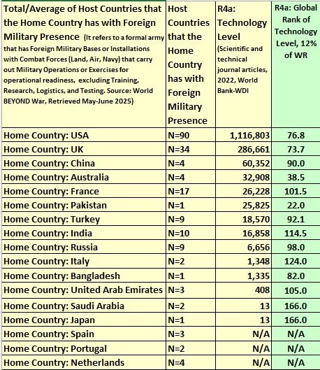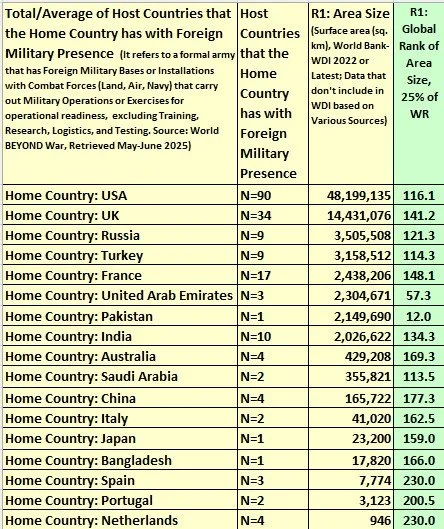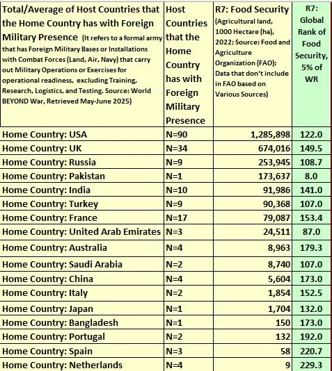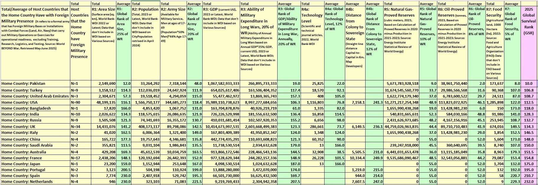 Table 160. Total of Host Countries per Each Home Country with Foreign Military Presence: Global Survival Rank Indicators (R1-R7) - Total and Average of Each Indicator, sorted by the Average of 2025 Global Survival Rank (GSR)