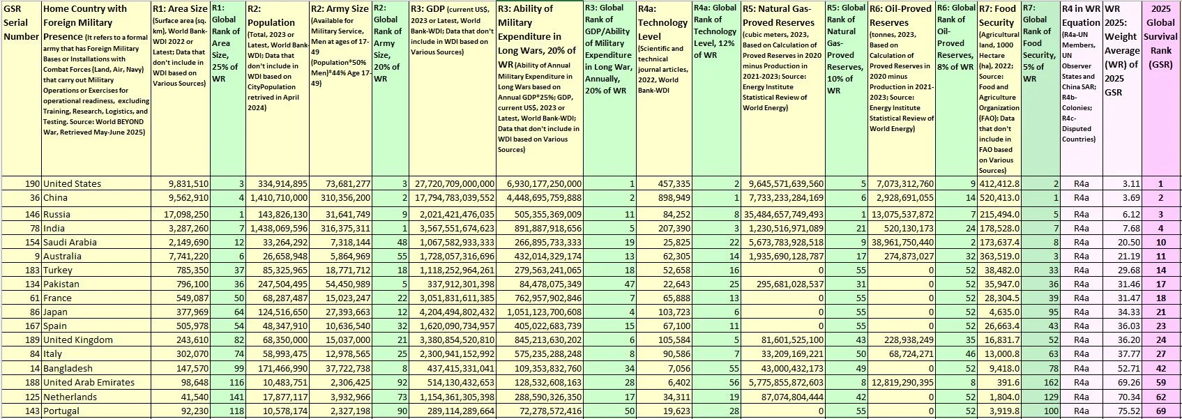 Table 159. List of Home Countries with Foreign Military Presence: Global Survival Rank Indicators (R1-R7), sorted by 2025 Global Survival Rank (GSR)