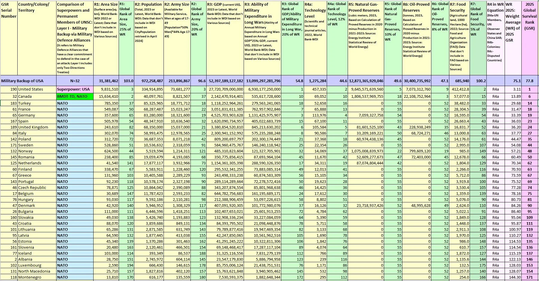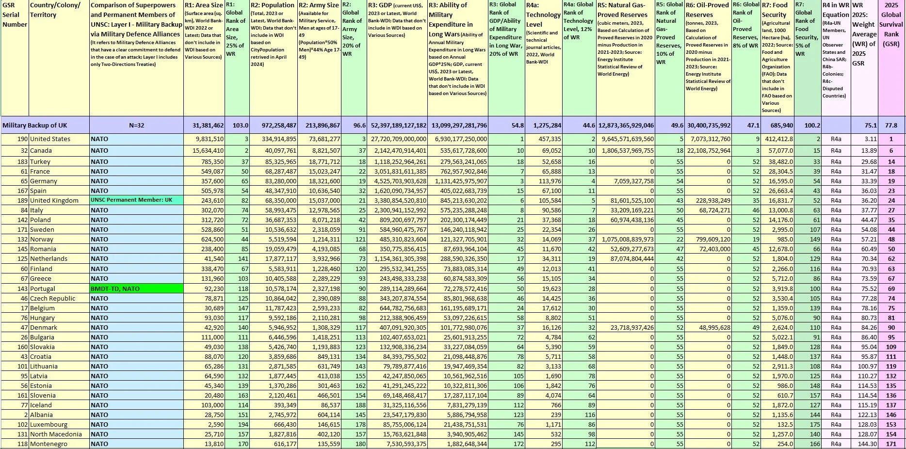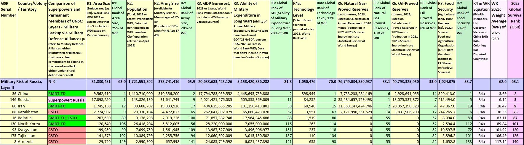 Table 171. Comparison of Layer II - ‘List of Countries Level’: Military Risk of Military Defence Alliances, Colonies, and Territories - List of Countries Included in MMDTs, BMDTs, Colonies, and Territories of Each Superpower/Permanent Members of UNSC, sorted by Average of 2025 Global Survival Rank (GSR)