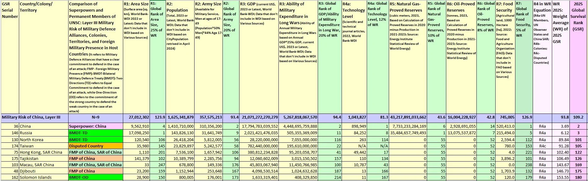 Table 173. Comparison of Layer III -‘List of Countries Level’: Military Risk of Military Defence Alliances, Colonies, Territories, and Foreign Military Presence - List of Countries Included in MMDTs, BMDTs, Colonies, Territories, and Foreign Military Presence of Each Superpower/Permanent Members of UNSC, sorted by Average of 2025 Global Survival Rank (GSR)