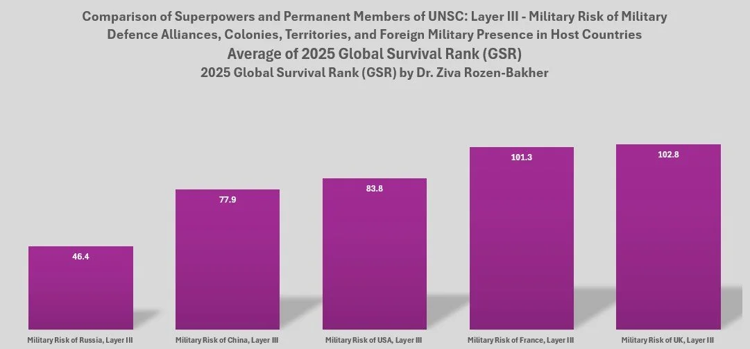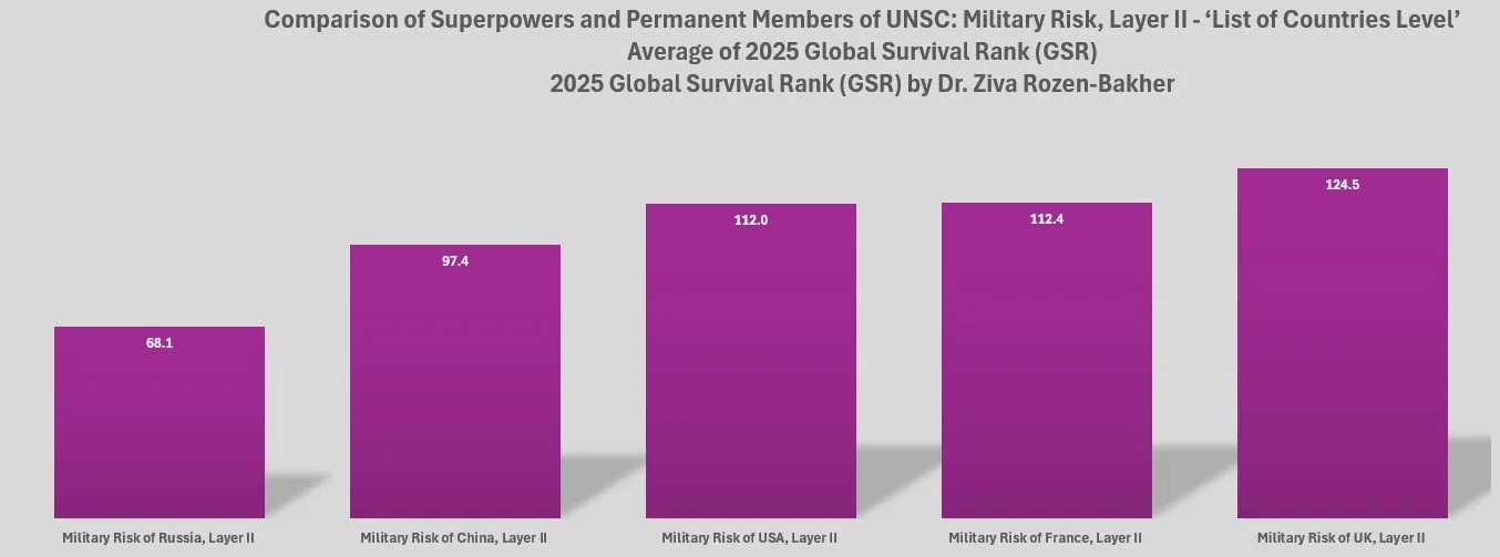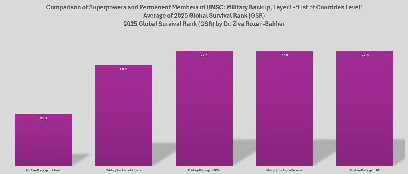 Section F5. Comparison of Superpowers/ Permanent Members of UNSC: Military Backup and Military Risk, 2025 Global Survival Rank (GSR) by Dr. Ziva Rozen-Bakher