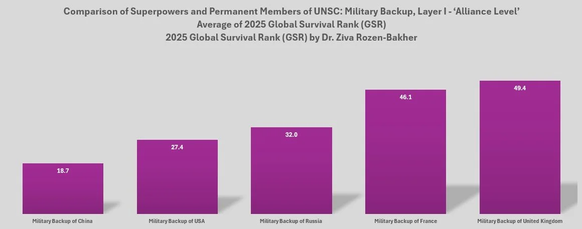 Chart 131. Military Backup and Military Risk: Comparison of Layers I, II, III per Each Superpower/Permanent Member of UNSC at ‘Alliance Level’ by Average of 2025 Global Survival Rank (GSR)