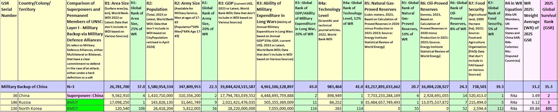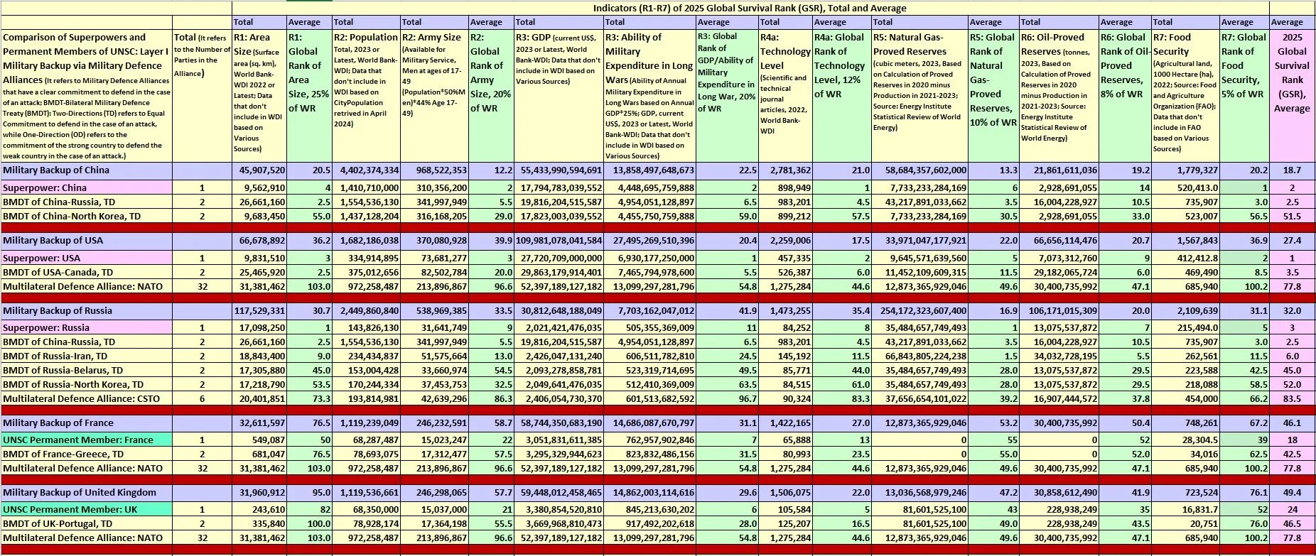 Table 168. Comparison of Layer I - ‘Alliance Level’: Military Backup via Military Defence Alliances - Total MMDTs and BMDTs of Each Superpower/Permanent Members of UNSC, sorted by Average of 2025 Global Survival Rank (GSR)