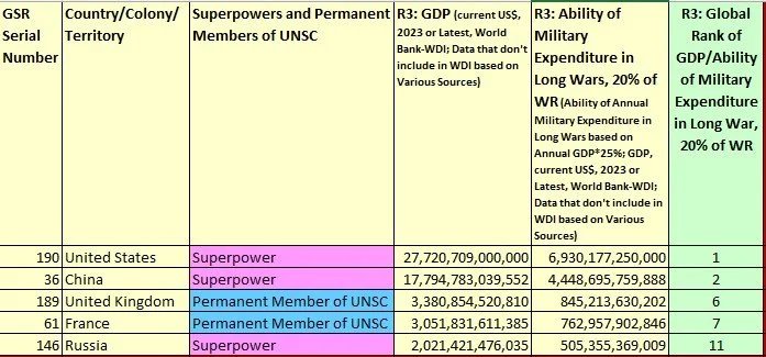 Table 167. List of Superpowers/Permanent Members of UNSC: Global Survival Rank Indicators (R1-R7), sorted by Total of Each GSR Indicator (R1-R7) (Higher to Lower)