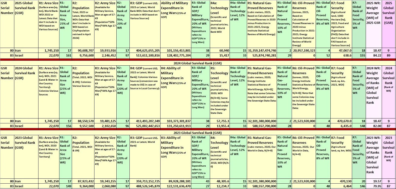 Table 179. 12-Day War between Iran and Israel: Global Survival Rank Indicators (R1-R7) of Iran versus Israel, GSR 2023 - GSR 2025