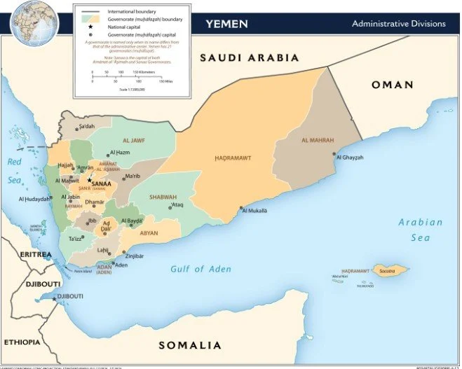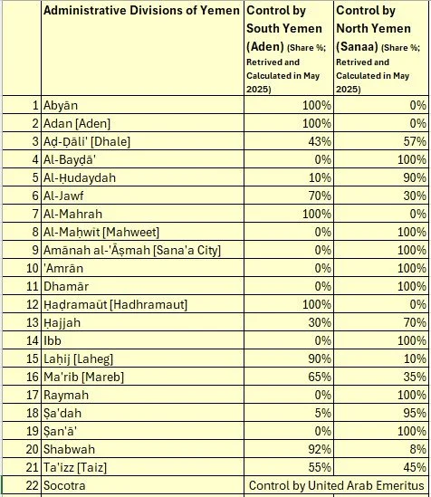 Step I: Revealing the areas in Yemen that are controlled by North Yemen (Sanaa) versus South Yemen (Aden) at the level of the Administrative Divisions of Yemen. See Section H1.4