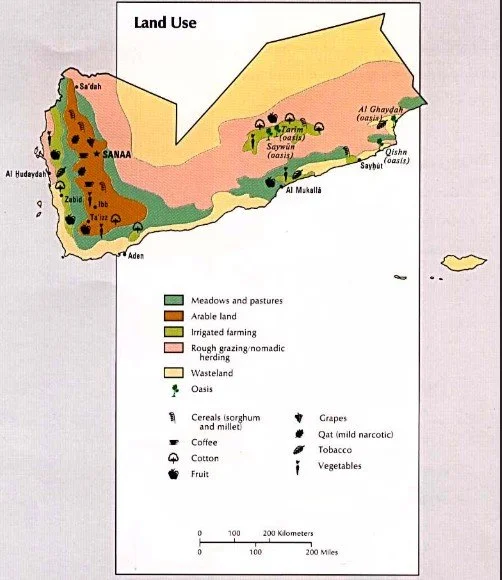 The Food Security indicator is tested in the Global Survival Rank (GSR) via the Agricultural Land, but there is no updated formal data about the Agricultural land in North Yemen (Sanaa) versus South Yemen (Aden). However, there is information about the Land Use in Yemen (see Maps below), which allows understanding of where Agricultural Land exists at the level of the Administrative Divisions of Yemen. Considering the above, the evaluation regarding the Agricultural Land is that the relative share of North Yemen (Sanaa) is around 70% of the Agricultural Land of Yemen, while the relative share of South Yemen (Aden) is around 30% of the Agricultural Land of Yemen.