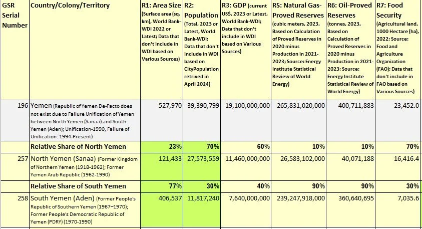 Acknowledge: Unclear Why the Relative Share was Appeared by Mistake in the Final Table of the 2025 Global Survival Rank (GSR) regarding the Indicators of Area Size (R1) and Population (R2) of North Yemen (Sanaa) and South Yemen (Aden), so it is possible to see the correct calculation in the table below regarding these two indicators. Keep in mind that this mistake has a minor impact on the 2025 Global Survival Rank (GSR) of North Yemen (Sanaa) and South Yemen (Aden).