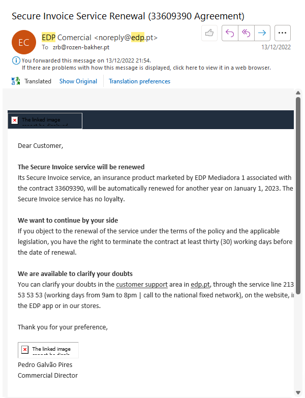 Suspected SMS that mentioned that the contract with EDP voids. On 15 November 2022, Dr. Rozen-Bakher received a suspected SMS that her contract with EDP Voids, despite that she did not make any change to the contract. Likely that ICCG cancelled the original contract and made instead ICCG-Contract on behalf of Dr. Rozen-Bakher and without her permission. (see below the SMS in Portuguese and its translation to English.). This manipulation likely explained why after the first payment via the direct debit, the other payments were not via the direct debit but via ‘taking money’ from the bank account without permission for that. Besides, this manipulation likely explained why the second-meter reading vanished from the system of EDP.