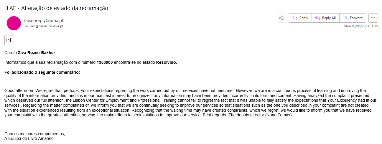 IEFP responded to Complaint I and Complaint II on 08 May 2023 instead of on 02 May 2023 as required by Portuguese law.