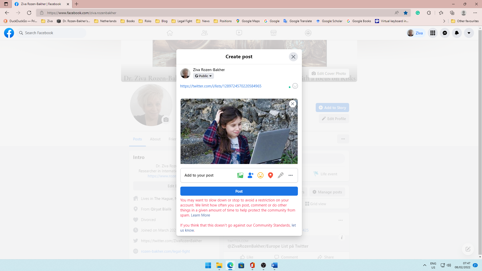 After 26 posts of manipulated Twitter Lists, Facebook restricted additional posts, while 3 days earlier, on 5 February 2022, Dr. Rozen-Bakher posted around 200 posts at the same time frame without any restrictions from Facebook, yet Dr. Rozen-Bakher did not get any like for any posts of her blog, forum, monitor-risks, publications and more on Facebook and Twitter, excluded only one post with her picture about collaboration that got likes on Facebook, so Likely, that ICCG, hide all the 200 posts from the public on Facebook and Twitter, as happened with all the blog posts a few months earlier.