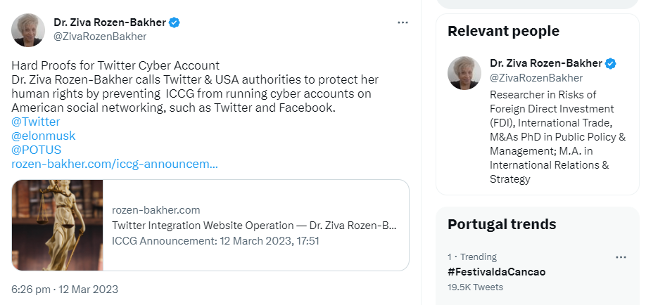 On 12 April 2023, Dr. Rozen-Bakher found out that ICCG blocked the share connection of Twitter from all the pages on her website, despite that it should be connected (see below). Even after a few tries to reconnect the sharing of Twitter, then it still showed that no account is connected to the website. Despite this blocking, a new Tweet appeared on her Twitter Timeline on her website. This operation gives hard proof that ICCG runs a fabricated Twitter Cyber Account for Dr. Ziva Rozen-Bakher, namely when Dr. Rozen-Bakher makes integration between her website and Twitter, then she got a fabricated Twitter account, as shown below. In other words, instead of appearing her picture and her name on Twitter, then appears 'Twitter User' with fabricated tweets, yet when making click on the 'Twitter User', then it forward to Dr. Ziva Rozen-Bakher’s Twitter cyber account. Importantly, all tweets of the 'Twitter User' appear in Portuguese that ICCG wrote or ICCG used tweets that someone else wrote, still, without any tweet that Dr. Rozen-Bakher wrote on her Twitter account.