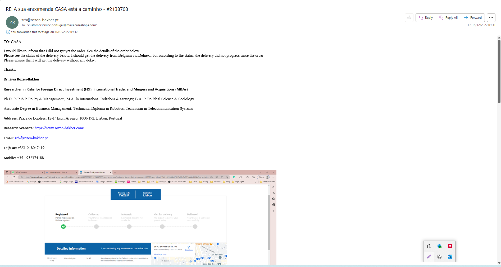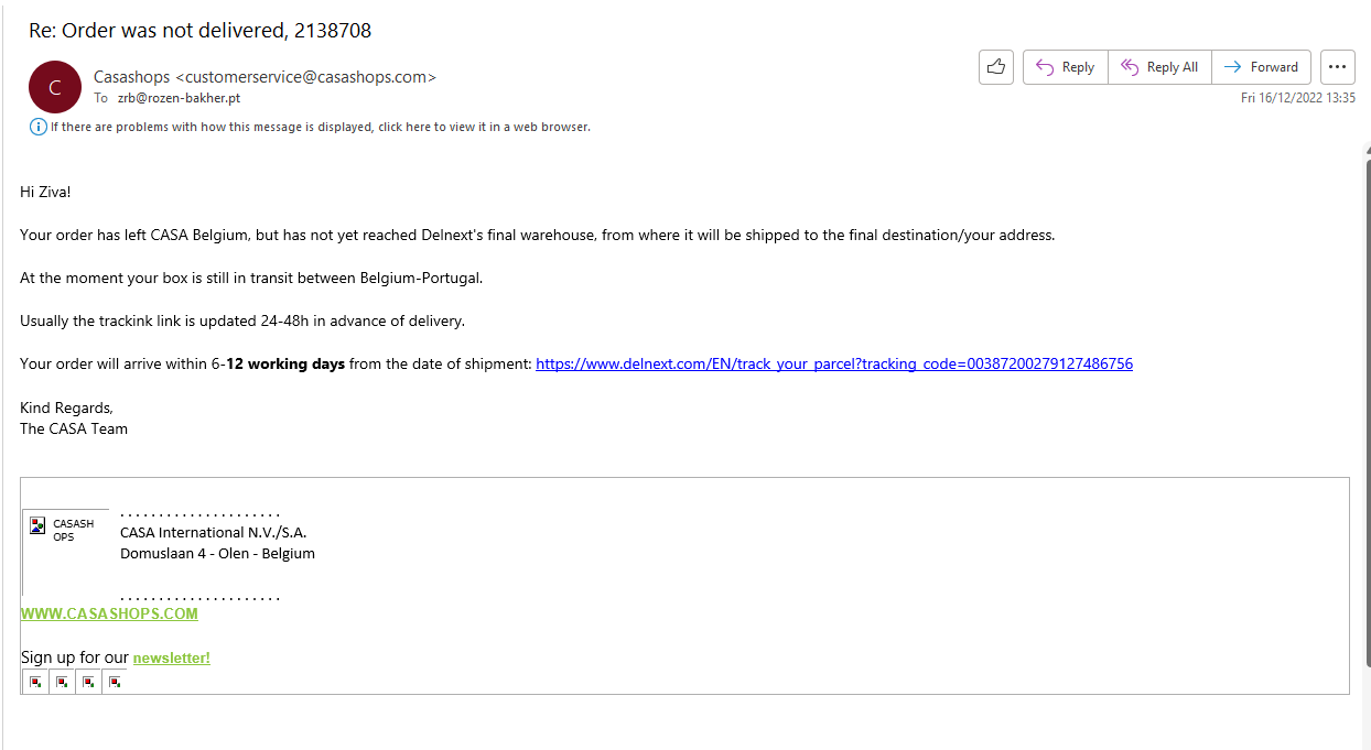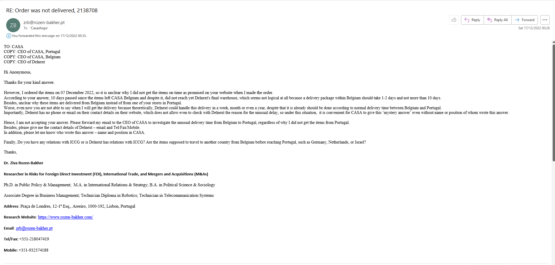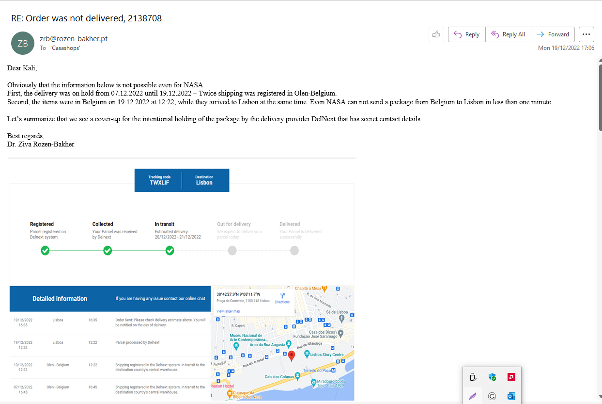 On 06 December 2022, Dr. Rozen-Bakher made an online order from CASA (Number of Order: 2138708, but it did not deliver on time as promised. More specifically, on 07 December 2022, Dr. Rozen-Bakher got an email from the delivery provider - DelNext - that they should deliver the items within a few days, but according to the delivery records, DelNext held 12 Days the Package in Olen-Belgium with 2 Registered Shipping on DelNext System - the first one on 07.12.2022 at 16:45 and the second one on 19.12.2022 at 12:22. Besides, the Fabricated Delivery Records showed that the Package was at once in Belgium and Lisbon. Even NASA Can’t send a Package from Belgium to Lisbon in less than one minute. Importantly, when the package was delivered at home in Lisbon on 20.12.2022, the Order Number in the 'Invoice'/Shipping Certificate was different (1023009591, 08.12.2022) from the Order Number (2138708, 06.12.2022) when the order was made. During the delay process, Dr. Rozen-Bakher tried to approach DelNext, but DelNext had no contact details on their website, while Casa did not respond to her request to provide the contact details of DelNext. Clearly, that intentional delay was made in this delivery, as done in other cases with the objectives of ‘Spy-Manipulation’ or ‘Material-Manipulation’ (See OP073 and OP080).