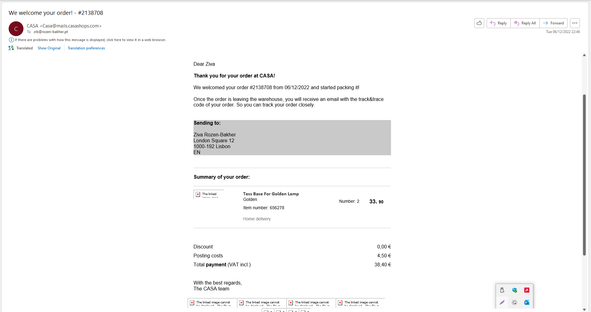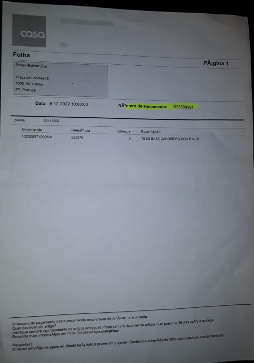 When the package was delivered at home in Lisbon on 20.12.2022, the Order Number in the 'Invoice'/Shipping Certificate was different from the Original Order Number: