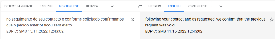Suspected SMS that mentioned that the contract with EDP voids. On 15 November 2022, Dr. Rozen-Bakher received a suspected SMS that her contract with EDP Voids, despite that she did not make any change to the contract. Likely that ICCG cancelled the original contract and made instead ICCG-Contract on behalf of Dr. Rozen-Bakher and without her permission. (see below the SMS in Portuguese and its translation to English.). This manipulation likely explained why after the first payment via the direct debit, the other payments were not via the direct debit but via ‘taking money’ from the bank account without permission for that. Besides, this manipulation likely explained why the second-meter reading vanished from the system of EDP.