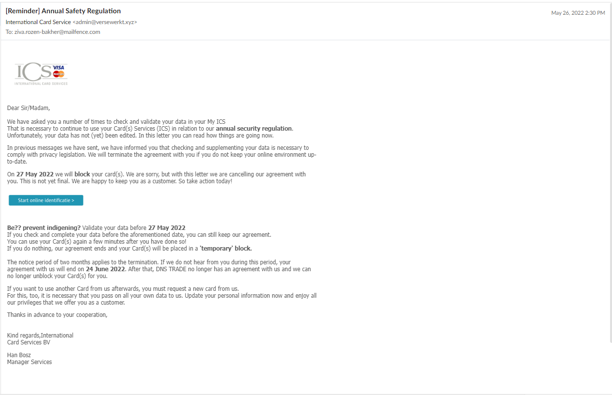 On 03 May 2022, after the order of the flight ticket to Portugal, suddenly, Dr. Rozen-Bakher got a suspected fabricated email from ICS that argued that she ignored previous notices from ICS to validate her data on ICS and because of that, ICS is going to block her credit card on 07 May 2022, a one day before her travelling to Lisbon to deal with the renewing of her passport. First, Dr. Rozen-Bakher didn’t get any previous notices from ICS to make validation. Second, the credit card was a new one. She got it only a few months earlier, so she made the validation of the card with her passport when she activated the credit card. She made the validation with her passport together with her son. Obviously, the demand for repeated validation was done by ICCG as an excuse to block the card, because when Dr. Rozen-Bakher tried to make repeated validation, nothing appeared on the screen, so the request for validation was fabricated. Besides, the email was sent from a suspected address (admin@nutnhr.info) that seems different from the other emails that Dr. Rozen-Bakher received from ICS, which signals that this email is likely fabricated. Moreover, any link from the suspected email did not work, so likely the page in the email runs under cyber.