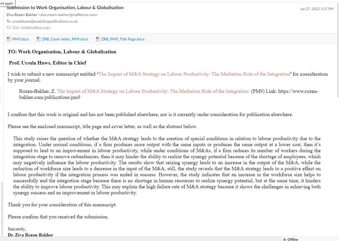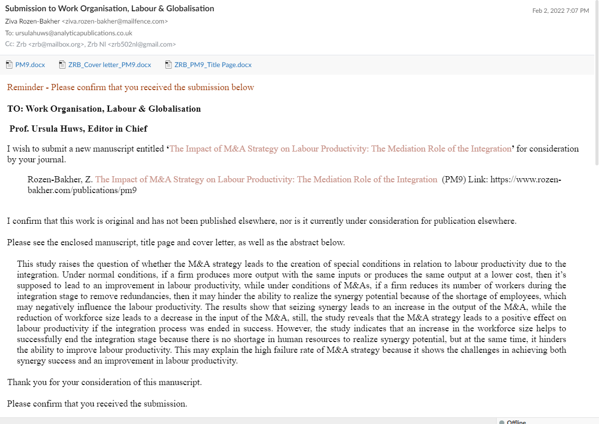 The submissions to this journal send via email and not online, so Dr. Rozen-Bakher submitted the submission via her Belgium mailbox of Mailfence. However, a confirmation email for the submission was not given over one month, despite repeated requests, so Dr. Rozen-Bakher inform publicly that she withdraws her submission with the journal Work Organisation, Labour & Globalisation.