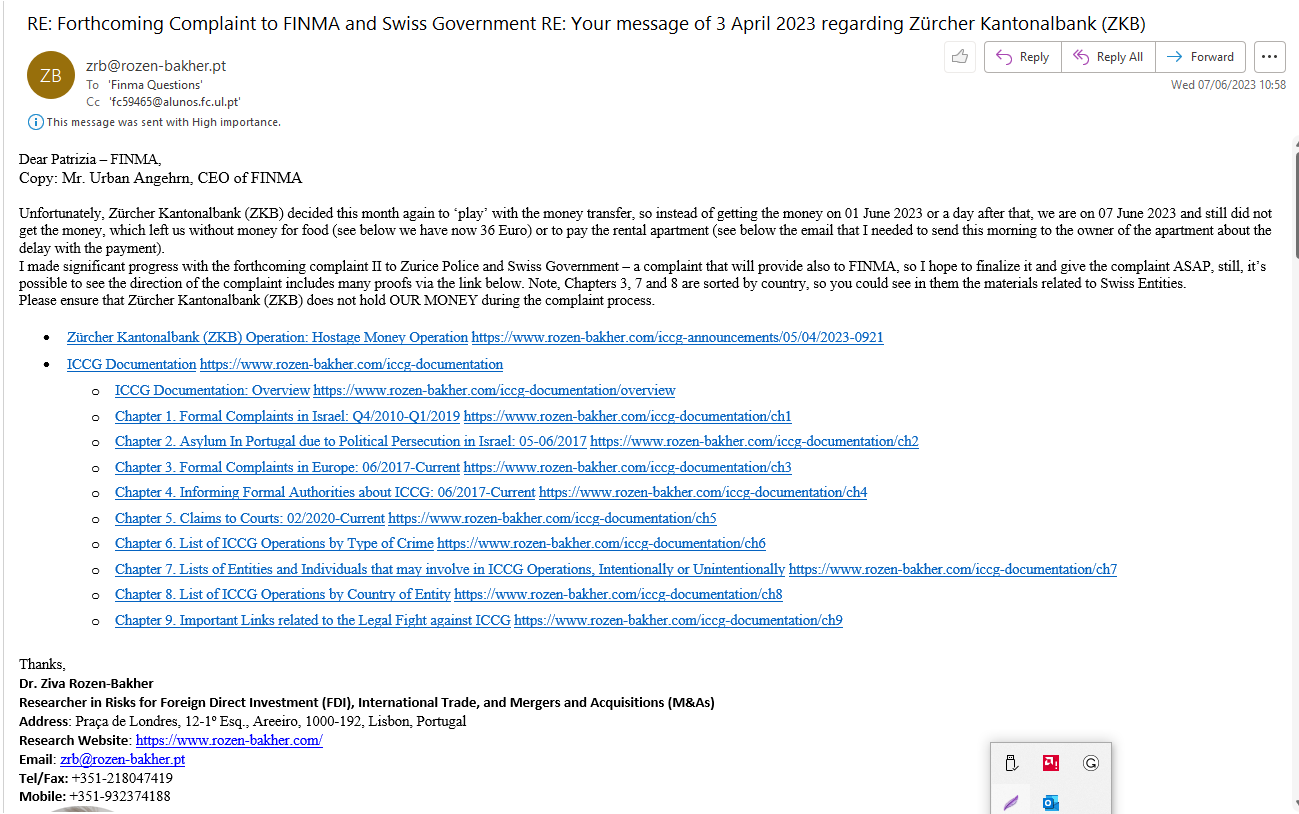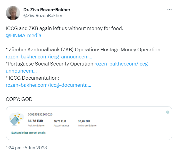 On 27 March 2023, Zürcher Kantonalbank (ZKB) started the ‘Hostage Money Operation’ amid the forthcoming complaint to FINMA and Swiss Government. Despite that Dr. Rozen-Bakher has money in her Swiss bank account, Zürcher Kantonalbank (ZKB) intentionally does not transfer money to the bank account of Dr. Rozen-Bakher in Portugal to left her without money even not for food in trying to obstruct justice and as a ‘revenge act’ amid the forthcoming complaint against Zürcher Kantonalbank (ZKB).