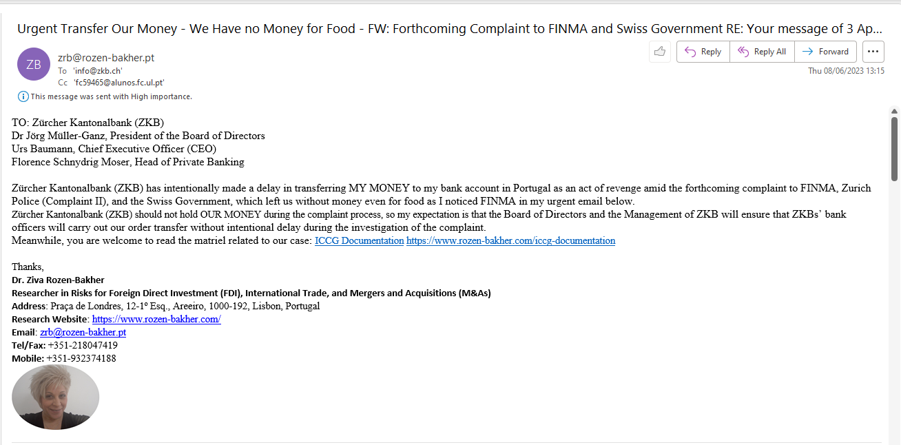 On 07 June 2023, Dr. Rozen Bakher sent an urgent email to FINMA amid the intentional delay in transferring money by ZKB in 06/2023 (see below).