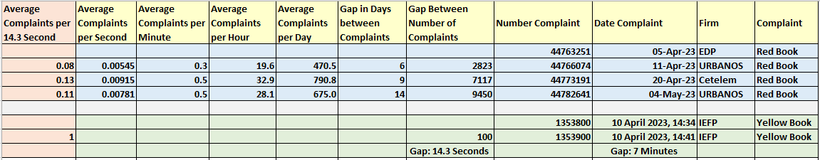 Average Time between Complaint I and Complaint II: 1353900-1353800=100 (gap)/7 (minutes)=14.3 Seconds