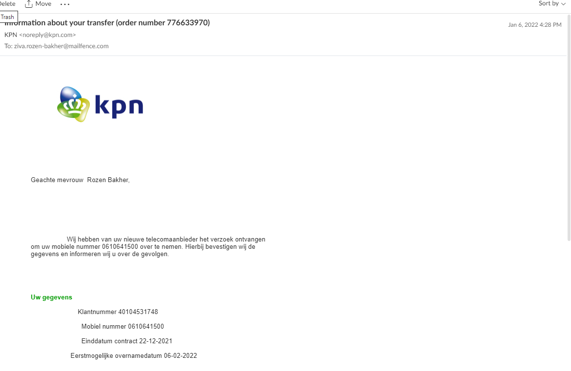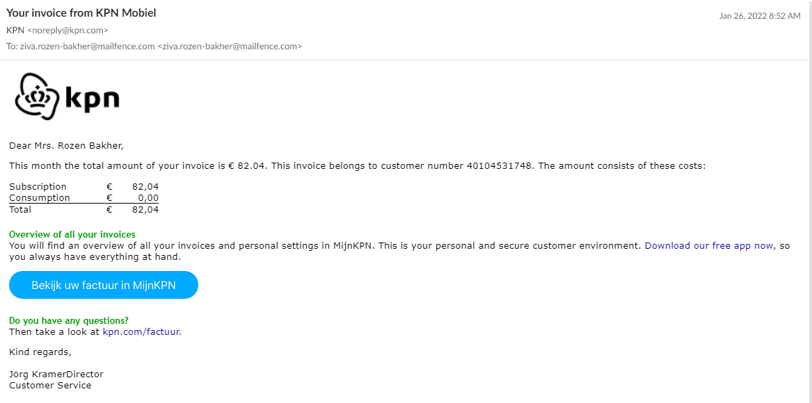 After the end of the contract on 28 December 2021, Dr. Rozen-Bakher got a monthly bill from KPN in the same amount of 53 Euro that was during the contract, for the period from 25.12.2021 until 24.01.2022.