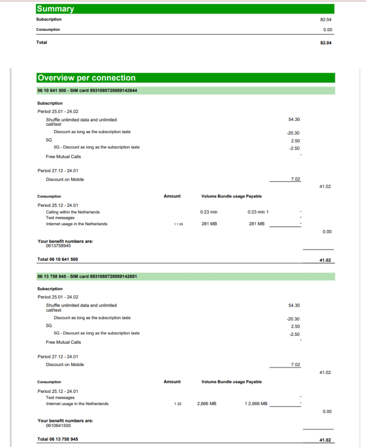 A yearly contract with KPN for 2 mobiles in a monthly bill of 53 Euro that was ended on 22 December 2021.