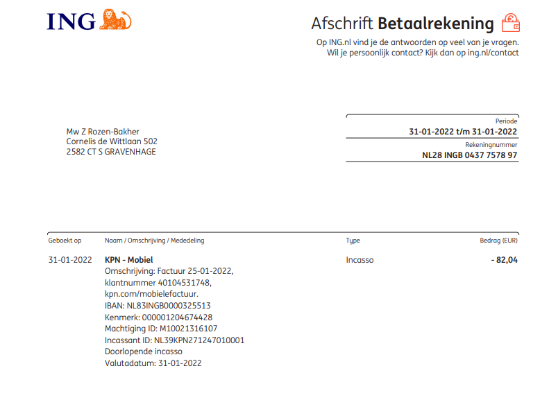 As part of KPN Mobile Operation, KPN sent a final bill of 82 Euro instead of 23 Euro for the dates of 25.01.2022 until 06.02.2022 (13 days/30 days*53 Euro=23 Euro), as explained below. Hence, the payment of 82 Euro via Dr. Rozen-Bakher’ ING bank account was cancelled and instead, the payment of 23 Euro was made via bank transfer to KPN.