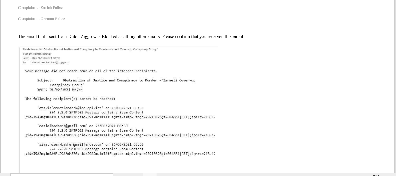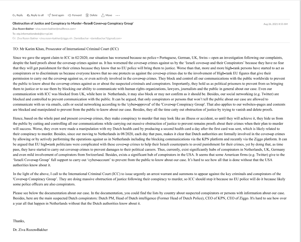 The email that was sent to ICC with this letter was blocked via the Mailbox of Ziggo, so the letter was sent to ICC via the Mailbox of Mailfence. Besides, an envelope with this letter was put by Dr. Rozen-Bakher and her son in the ICC Post-Box that locates at the Entry of ICC building. Dr. Rozen-Bakher NEVER got any response from ICC to this urgent letter.