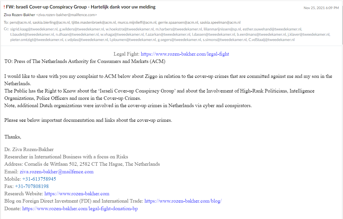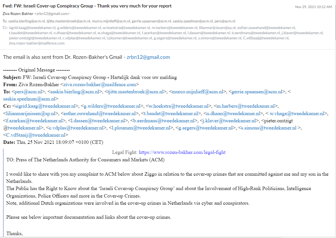 On 24 November 2021, Dr. Rozen-Bakher gave a complaint to Netherlands Authority for Consumers and Markets (ACM) about Ziggo Operation. A copy of the Complaint to ACM was also sent to the Dutch Government of Rutte III via two mailboxes of Dr. Rozen-Baker. However, Dr. Rozen-Bakher NEVER got any response from ACM nor from any other Dutch authorities regarding this complaint.